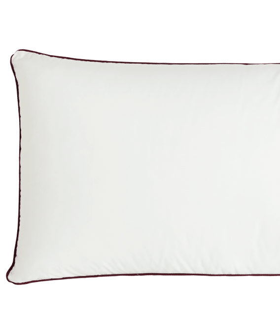 Fibre creuse cardée offrant un gonflant exceptionnel, enveloppe tissu 20 % polyamide 80 % polyester passepoil couleur bordeau et galon BELNOU. Oreiller entièrement lavable en machine hauteur 18 cm